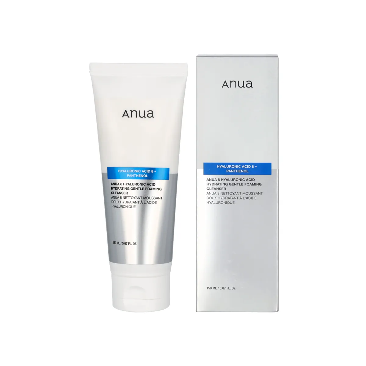 ANUA 8 Hyaluronic Acid Hydrating Gentle Foaming Cleanser is a gently foaming cleanser with an 8-type hyaluronic acid complex, designed for multi-layer hydration. High molecular weight forms act on the surface, while low and very low molecular weights diffuse deeper, and sodium hyaluronate crosspolymer and sodium acetylated hyaluronate help create a lasting, water-attracting, film-like comfort. The result: cleanliness without tightness, skin feels supple, unburdened, and soft as after a light moisture compress.