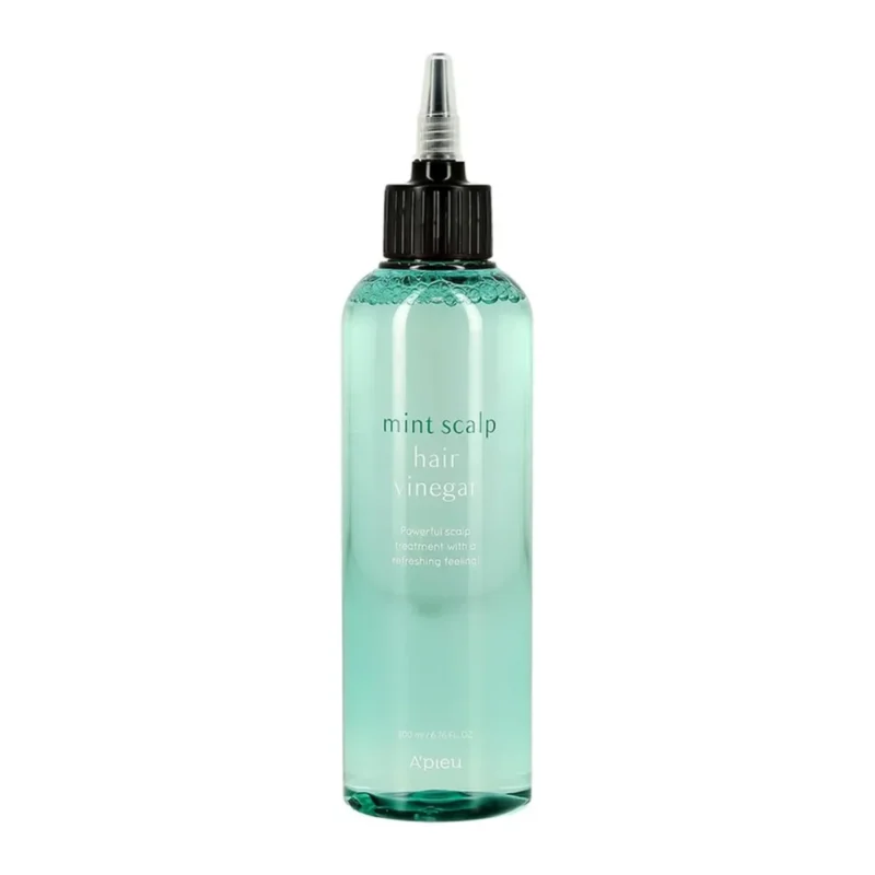 Moisten your hair and scalp, evenly distribute A’PIEU Mint Scalp & Hair Vinegar on the scalp, gently massage with your fingertips, then rinse thoroughly with warm water; use after shampoo or instead of conditioner, recommended to use 2–3 times per week.