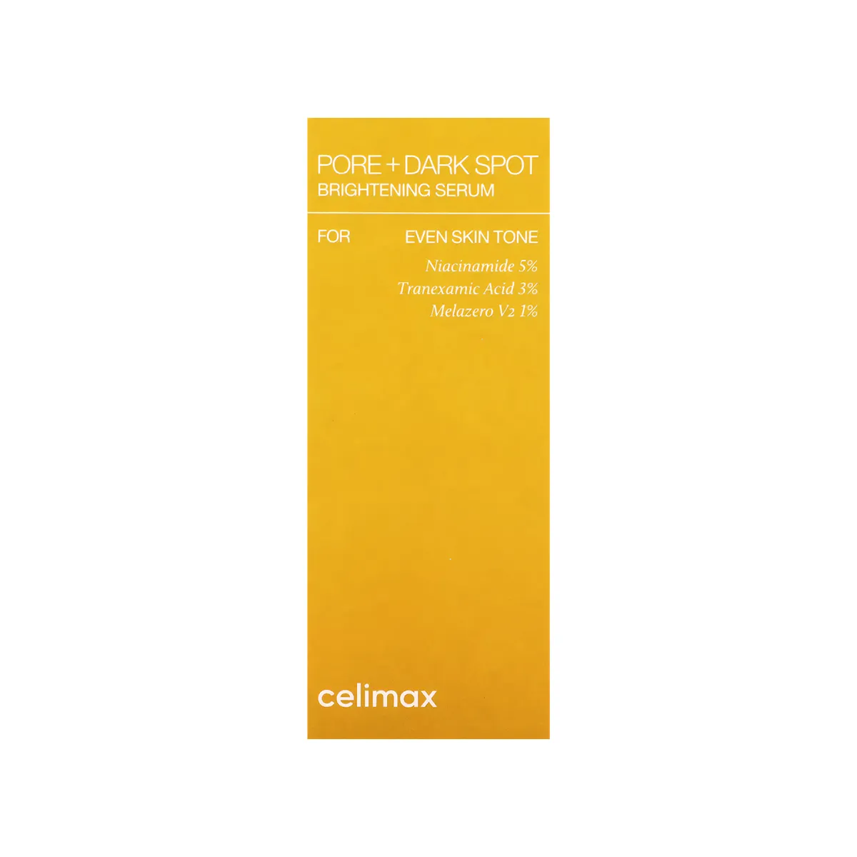 Apply CELIMAX Pore + Dark Spot Brightening Serum to clean, dry skin after cleanser and toner: dispense 2–3 drops onto your face, gently massage, focusing on areas with enlarged pores and dark spots, avoiding the eye and lip area; wait 1–2 minutes for it to absorb, then apply a moisturizer, and during the day, always apply broad-spectrum SPF 30 or higher sun protection. Use morning and/or evening; if your skin is sensitive, start once daily or every other day and gradually increase frequency. Do not combine in the same application with strong acid exfoliants or retinoids; if you use them, apply on different days. Before first use, perform a patch test on a small skin area 24 hours in advance. Do not use on irritated or damaged skin; in case of irritation, discontinue use. Keep tightly closed, in a cool, sun-protected place, out of reach of children.