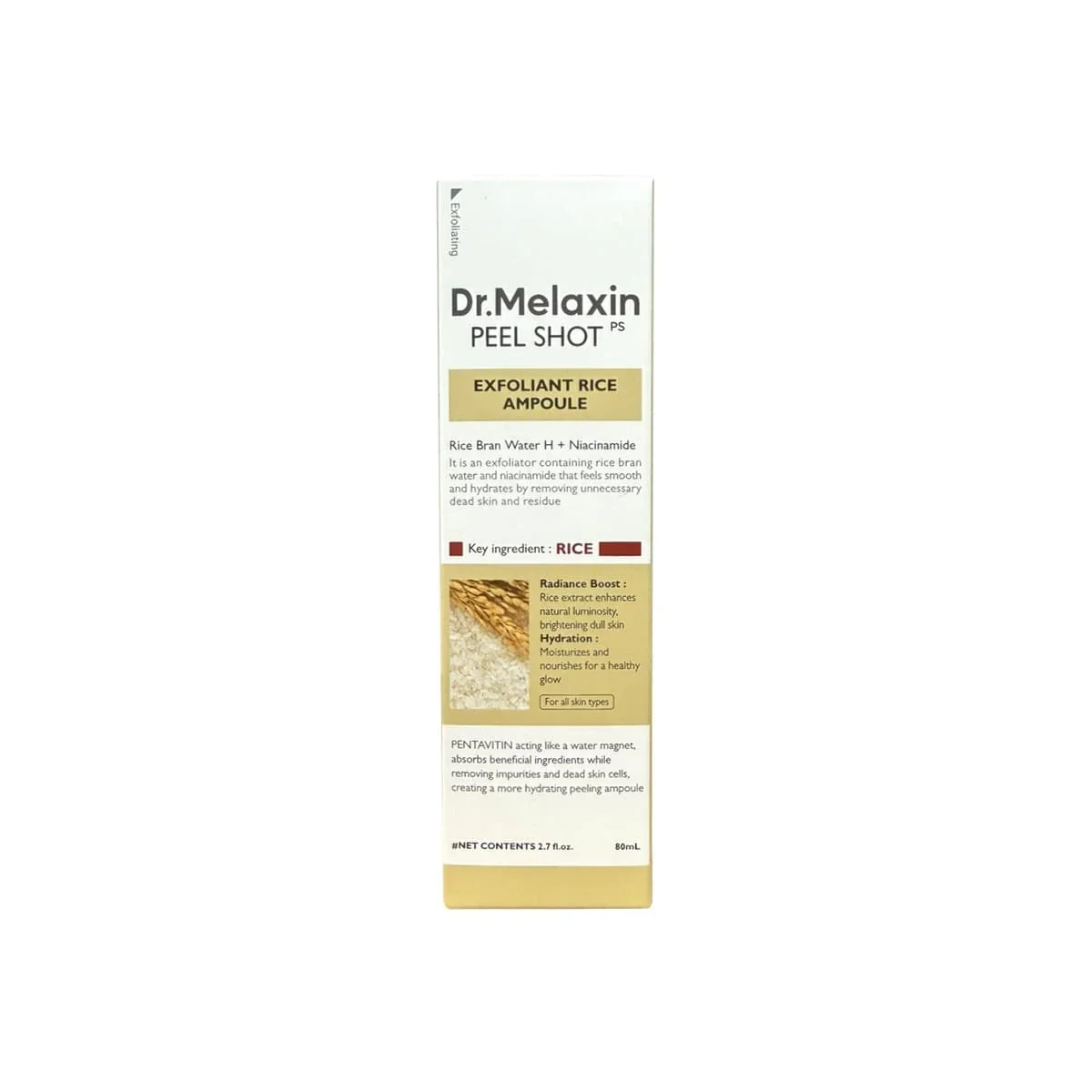 Apply DR. MELAXIN Peel Shot Exfoliant White Rice Ampoule to clean, dry facial skin (avoiding the eye and lip area), spread evenly and leave on for 1–3 minutes the first time, later, if the skin tolerates it well, up to 5–10 minutes; if strong stinging or redness occurs, rinse immediately with lukewarm water; use 1–2 times per week, after use apply a moisturizing cream, and during the day always use SPF 30–50.