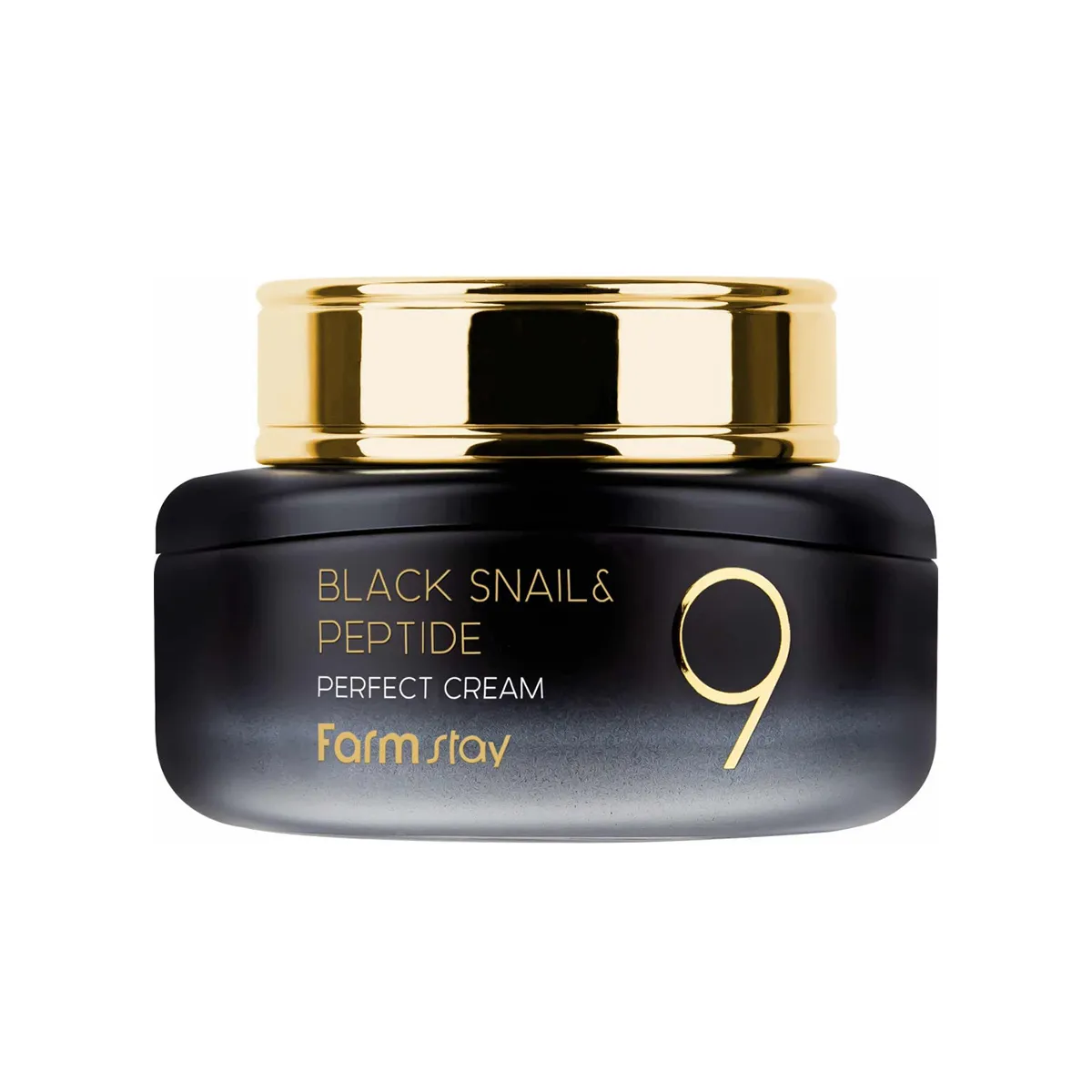 FARMSTAY Black Snail & Peptide 9 Perfect Cream – a black snail and peptide cream – is built on two pillars. The first: black snail secretion filtrate, rich in mucopolysaccharides, glycoproteins, and allantoin. These components act as highly effective humectants and calming mediators: they strengthen the skin’s moisture reservoir, reduce roughness, and help the skin recover faster after environmental stress. The second: a 9-peptide complex. Signal peptides stimulate dermal protein synthesis processes, carrier peptides support the delivery of microelements, and neuromimetic peptides soften tension lines. Together, they work synergistically – for elasticity, density, and the visual reduction of fine lines.