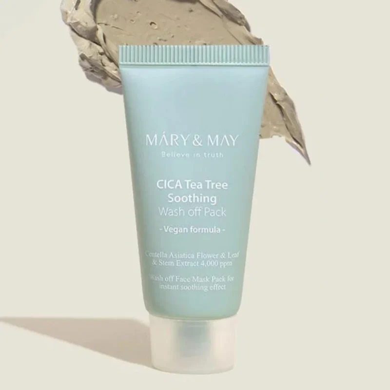 Apply a sufficient amount of MARY&MAY Cica Teatree Soothing Wash Off Pack onto clean, dry facial skin, spread evenly avoiding the eye and lip area, leave on for 10–15 minutes, then rinse thoroughly with warm water; use 2–3 times a week or as needed to reduce redness, irritation, and improve skin condition.